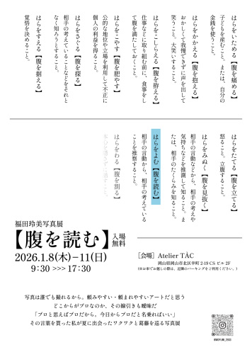 EVENTAtelier TÀC(アトリエタック)は岡山市北区幸町にあるギャラリースペースです。MAP 2026/1/8(木)~1/11(日)「腹を読む」<写真展> 【終了】「高山の景色 ~EBCを歩いて~」<写真展> 【終了】「鮮やかな黒」展<絵画・グラフィック展> 過去のイベント一覧 INFO 岡山のまちなかにあるアート&コミュニティスペースです。